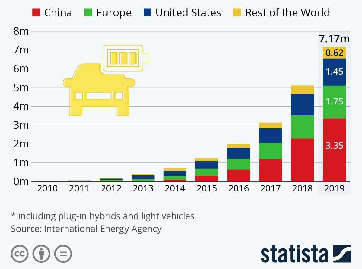 Na grafikonu možete vidjeti rast prodaje električnih automobila u svijetu (u svijetu je na kraju 2019. godine bilo 7,17 milijuna električnih automobila), a pogled na 2010. godinu pokazuje praktički nulu. IEA očekuje da će u 2020. godini električni automobili biti prodavani kao i u 2019. godini, bez obzira na krizu koja je već zahvatila automobilsku industriju u cijelom svijetu. Globalno tržište osobnih automobila u 2020. godini, prema procjenama, imat će pad od 15 posto.
