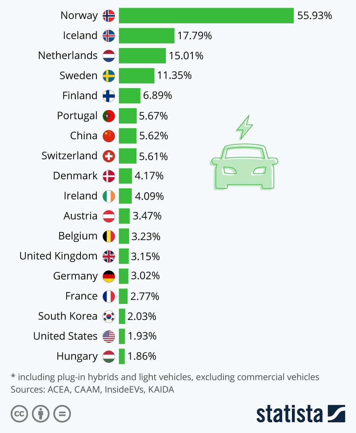 Norveška je zemlja s najvećim udjelom plug-in električnih automobila, u ukupnoj prodaji u 2019. godini. Udio je 55,93 posto, a slijedi Island s udjelom od 17,79 posto. Na trećem je mjestu Nizozemska s 15,01 posto udjela. Slijede dvije skandinavske zemlje u kojima je udio električnih automobila u ukupnoj prodaji također visok – Švedska (11,35 posto) i Finska (6,89 posto).