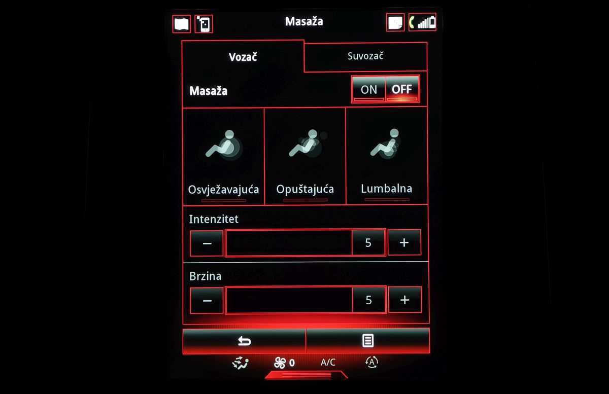 U kabini s kvalitetnim materijalima na dodir se nudi mogućnost priključivanja čak četiri uređaja na punjenje (dva USB ulaza namijenjena su putnicima straga, ako i 12-voltna utičnica). Prednja sjedala imaju i grijanje, podešavanje u lumbalnom dijelu. Naravno, masaža je posebna funkcija koja se ugodno koristi u tri različita načina i pet različitih brzina same masaže. Ipak, pravo multimedijsko iskustvo stiže tek nakon spajanja pametnih telefona na sam sustav. Istražili smo što nude Android Auto i Apple CarPlay, a kako je nedavno u Hrvatsku stigao Apple Music bila je to prilika i za isprobavanje aplikacije putem koje se nudi pristup do čak 60 milijuna pjesama.
