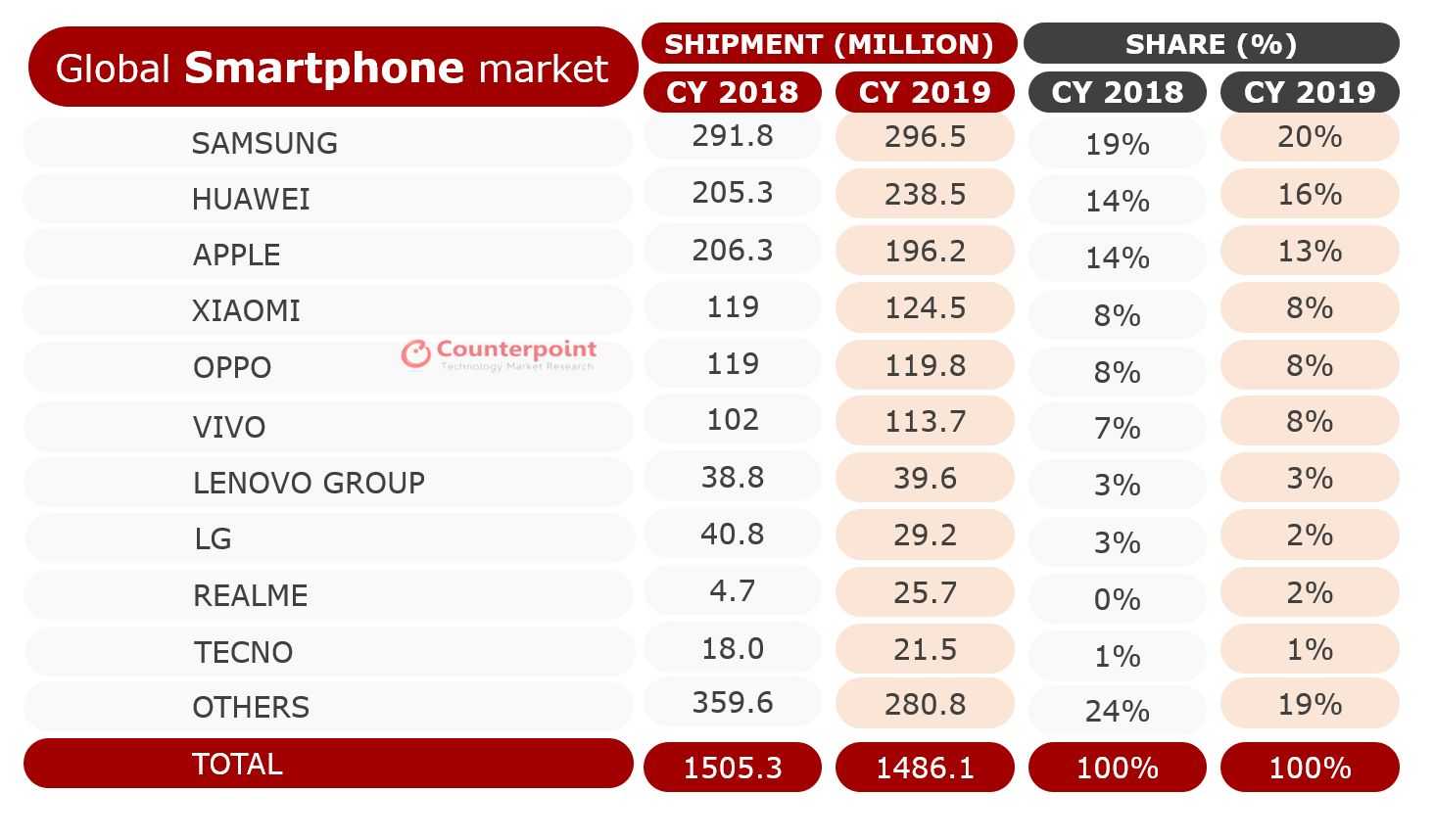 Prodaja mobitela odnosno pametnih telefona u svijetu u 2019. godini u padu je oko 1 posto u odnosu na 2018. I dok je u 2018. godini isporučeno 1.505.300 pametnih telefona, u 2019. ih je bilo 1.486.100. Podaci Counterpointa pokazuju da se po prvi put tržište pametnih telefona smanjuje dvije godine za redom, ali pad od 1 posto je bio znatno sporiji nego u 2018. Tad je pad iznosio 4 posto u odnosu na 2017. godinu.